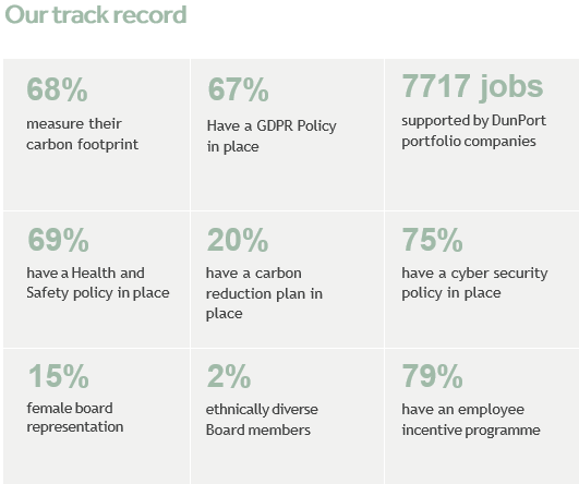 Environmental, Social and Governance (“ESG”) aspects of the businesses in which we invest are key considerations and are an integral part of our investment decision making process. DunPort has adopted a Responsible Investment policy to guide our investment and credit process to the companies to which we lend and the community in which we operate which we consider important to long term value creation.