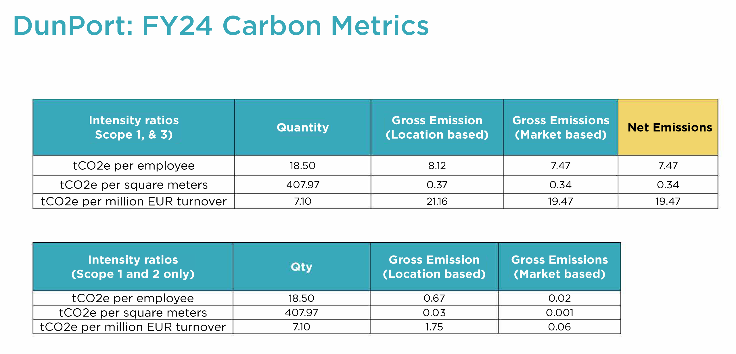 Purchased electricity was the only identified scope 2 emissions source. Per- the GHG Protocol Scope 2 and the UK Government’s Environmental Reporting Guidelines scope 2 emissions have been calculated in two ways using the location-based and the market-based methodology. A location-based method reflects the average emissions intensity of the grids on which energy consumption occurs. A market-based method reflects emissions from electricity from sources/locations that DunPort has purposefully chosen (e.g., specific green energy supply contracts, renewable energy guarantees of origin (REGO), green power purchase agreements (green PPA)). Actual electricity consumption data was provided for Ireland and estimated electricity consumption data based on actual information was provided for London.